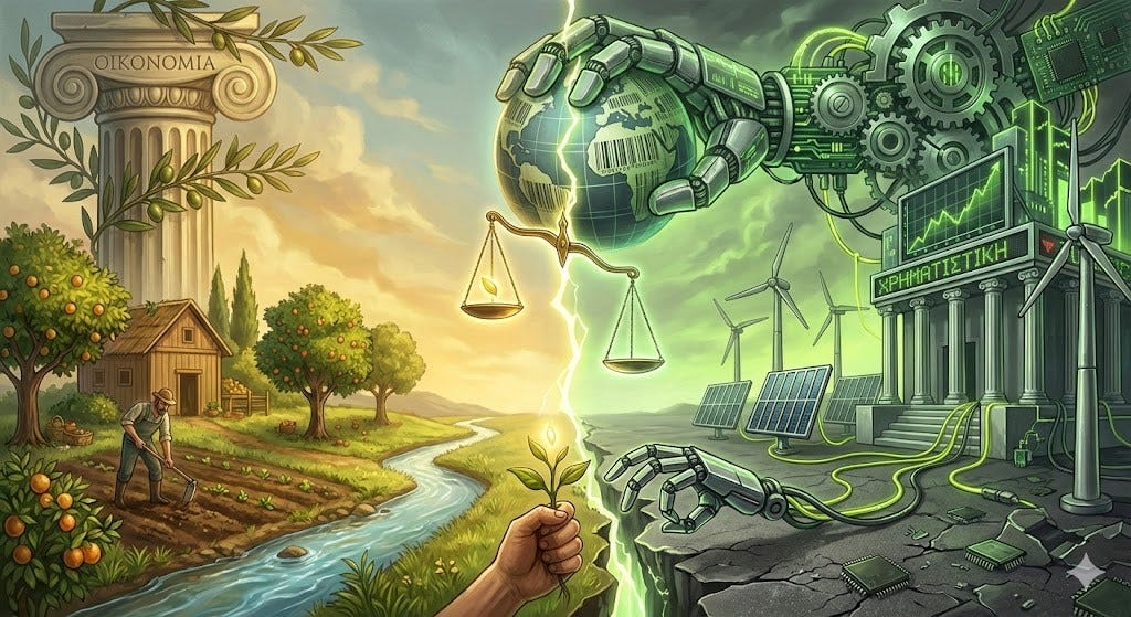 The current political and ecological agenda, often framed as the “Green Transition,” can be profoundly analyzed through the lens of Aristotelian philosophy as provided in his “Politics”. By applying the distinction between Oikonomikē (ΟΙΚΟΝΟΜΙΚΗ)-Economics and Chrematistikē (ΧΡΗΜΑΤΙΣΤΙΚΗ)-Finance, we reveal that many modern policies lack Phronēsis (ΦΡΟΝΗΣΙΣ)-(practical wisdom) and serve interests far removed from the “Good Life” - “εὖ ζεῖν” of people!